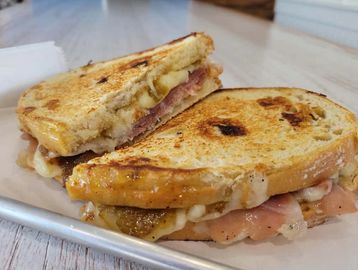 sliced Italian bread, fig jam, sliced prosciutto di Parma, melted mozzarella cheese