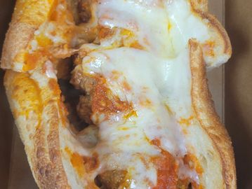 long roll, house made 100% all beef meatballs, marinara, melted mozzarella cheese, parmigiano Reggiano