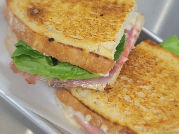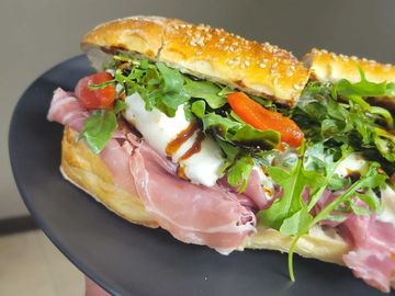 sliced Italian bread, imported prosciutto di Parma, melted mozzarella cheese, lettuce, tomato, mayo