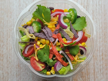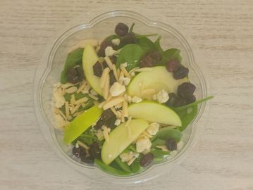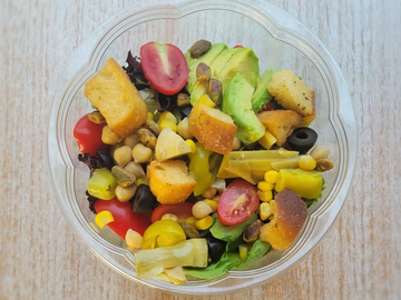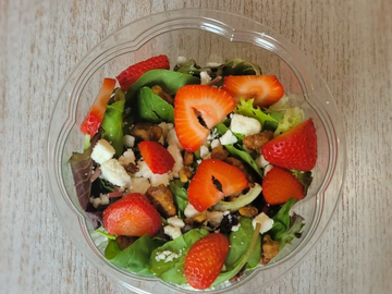 Apple, Artichokes, Bacon, Bell peppers, Black Beans, Candied pecans, Carrots, Cherry tomatoes, Chick peas, Corn, Croutons, Cucumbers, Dried cranberries, Edamame, Eggs, Jalapeno, Kalamata olives, Pepperoncini, Pignoli, Pistachio, Red Cabbage, Red onions, Roasted red peppers, Slivered almonds, Strawberries, Tortilla strips