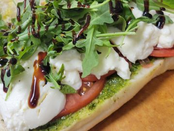 Fresh mozzarella, sliced tomatoes, arugula, pesto, olive oil, basil, balsamic glaze