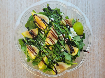 organic baby arugula, figs, crumbled goat cheese, pignoli, olive oil, balsamic glaze