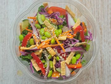 romaine lettuce, shredded red cabbage, carrots, cucumbers, edamame,