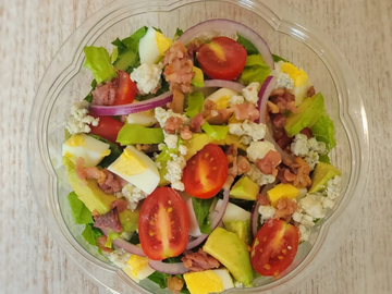 avocado, hard-boiled egg, red onions, bacon, crumbled blue cheese, blue cheese dressing