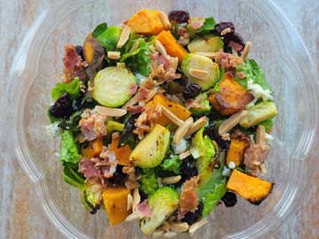 romaine lettuce, roasted sweet potatoes, roasted Brussels sprouts, crumbled bleu cheese, dried cranberries, slivered almonds